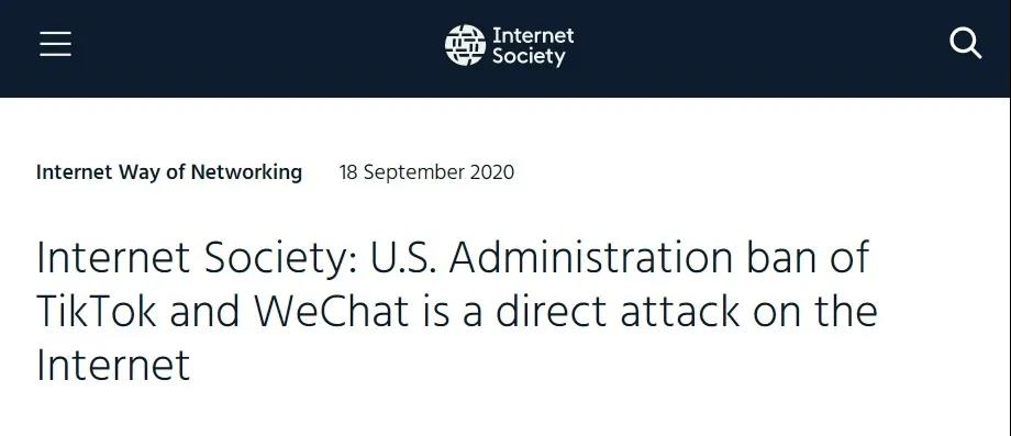 9月18日,針對日前美國政府對TikTok(抖音海外版)和微信的禁令,國際互聯網學會(Internet Society)發表聲明表示,美國政府對TikTok和微信的禁令是對互聯網的直接攻擊。