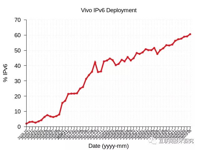 在巴西,當地最大的運營商Vivo于2015年10月開始推行IPv6,5年內IPv6部署率從0增長至60%(圖4)。