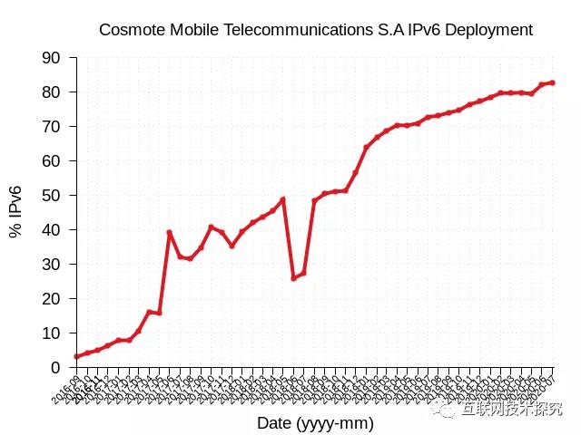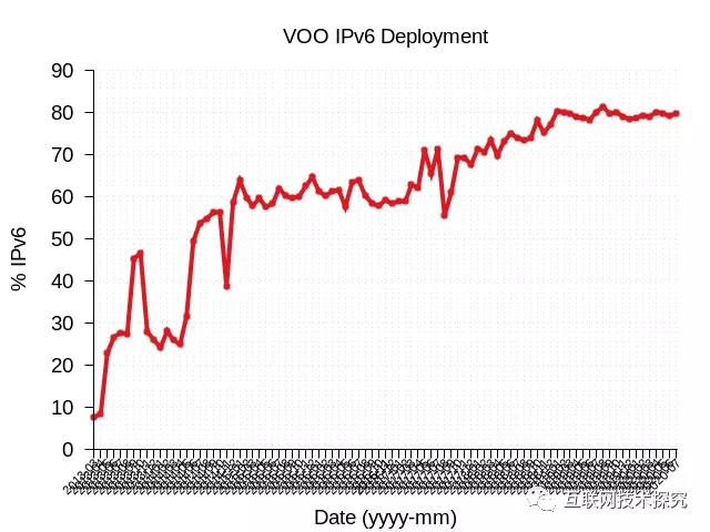 因此,他們的IPv6流量增加顯著,超過65%的用戶使用IPv6(圖9)。美國運營商AT&T的IPv6部署率達到了80%(圖10)。